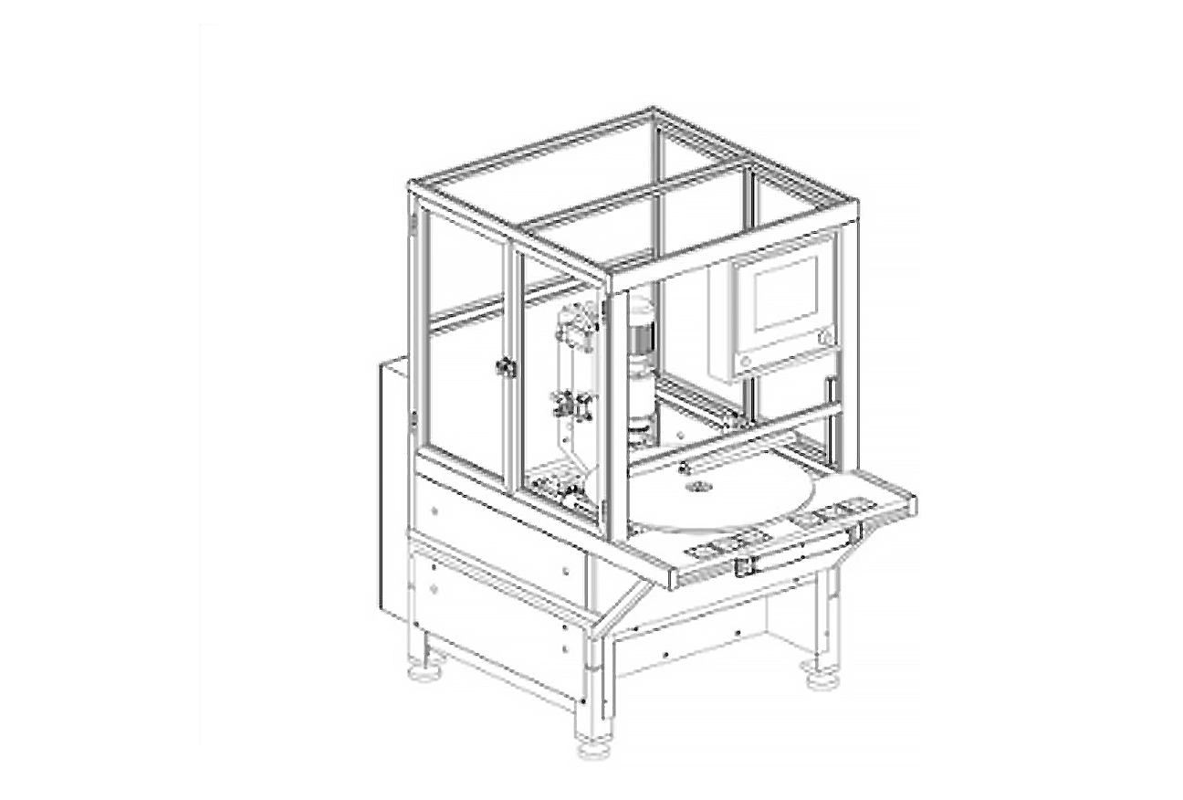Kompletna i autonomiczna stacja robocza z obudową bezpieczeństwa, nitownica współrzędnościowa (X = 200 mm, Y = 300 mm) z okrągłym stołem (Ø = 870 mm).